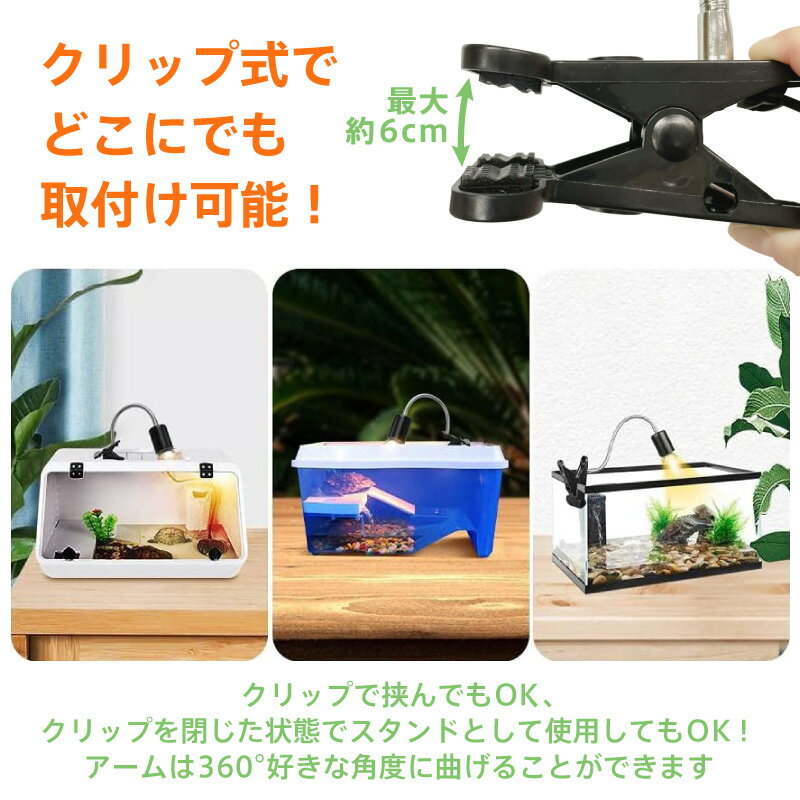 ■商品の仕様 サイズ(約) アーム長さ:30cmクリップ幅:7.3cm電球ソケット長さ:6cm電球ソケット直径:4.3cmコード長さ:2m電球サイズ:直径5cm ライト UVA + UVBフルスペクトル昼光UVAベースの放射波UVA:97% / UVB:3%(3.0) 電球ワット数 25W / 50W25Wは80cmのケージ、50Wは100cmのケージに適しています。